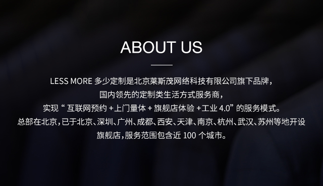 LESS MORE多少定制 2015年5月創(chuàng)立于北京,以互聯(lián)網(wǎng)思維和工業(yè)4.0切入服裝定制領(lǐng)域,獨創(chuàng)“互聯(lián)網(wǎng)預(yù)約+旗艦店體驗+免費(fèi)上門量體+工業(yè)4.0 C2M生產(chǎn)”的模式,現(xiàn)已成為國內(nèi)服裝定制行業(yè)的標(biāo)桿品牌。